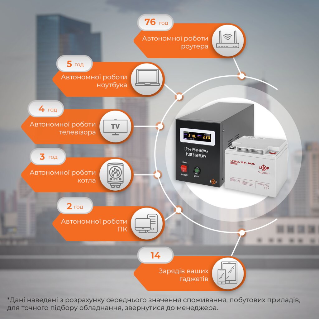 Комплект ИБП Logicpower LPY-W-PSW-500VA+(350Вт)5A/10A с правильной синусоидой 12В + Аккумулятор гелевый LPM-GL 12V — 40 Ah специально подобран для обеспечения бесперебойного питания электрических газовых котлов, систем видеонаблюдения, компьютерной техники и других электрических устройств, которые работают в режиме 24/7/365.