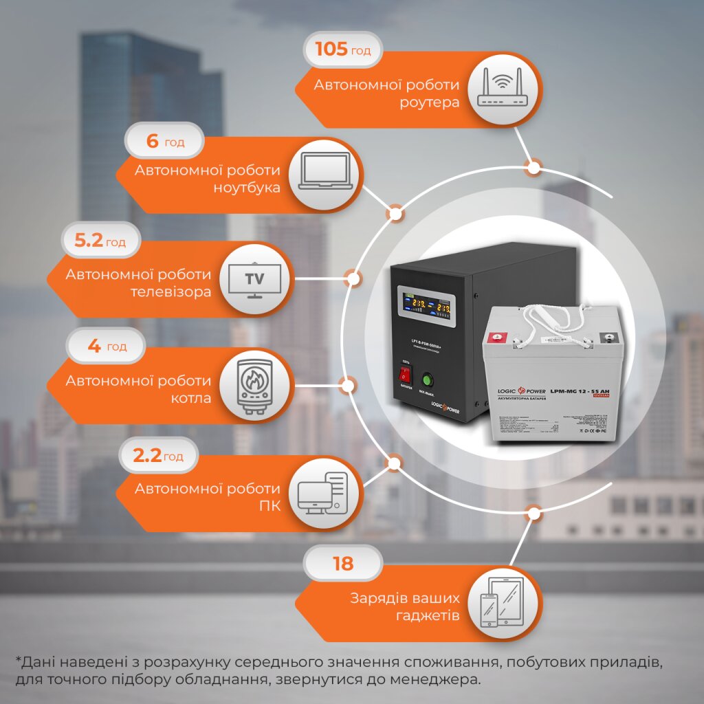Комплект ИБП Logicpower LPY-B-PSW-500VA+(350Вт) 5A/10A с правильной синусоидой 12В + Аккумулятор гелевый AGM LPM-MG 12V — 55 Ah специально подобран для обеспечения бесперебойного питания электрических газовых котлов, систем видеонаблюдения, компьютерной техники и других электрических устройств, которые работают в режиме 24/7/365.