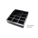 Оснащен 3-х позиционным замком – блокировка, электронное и ручное открытие и одним мультимедийным выходом. Имеет регулируемые лотки для банкнот (5 штук) и для монет (5 штук), 2 зажима для банкнот, а также оснащен опцией аварийного открытия денежного ящика.