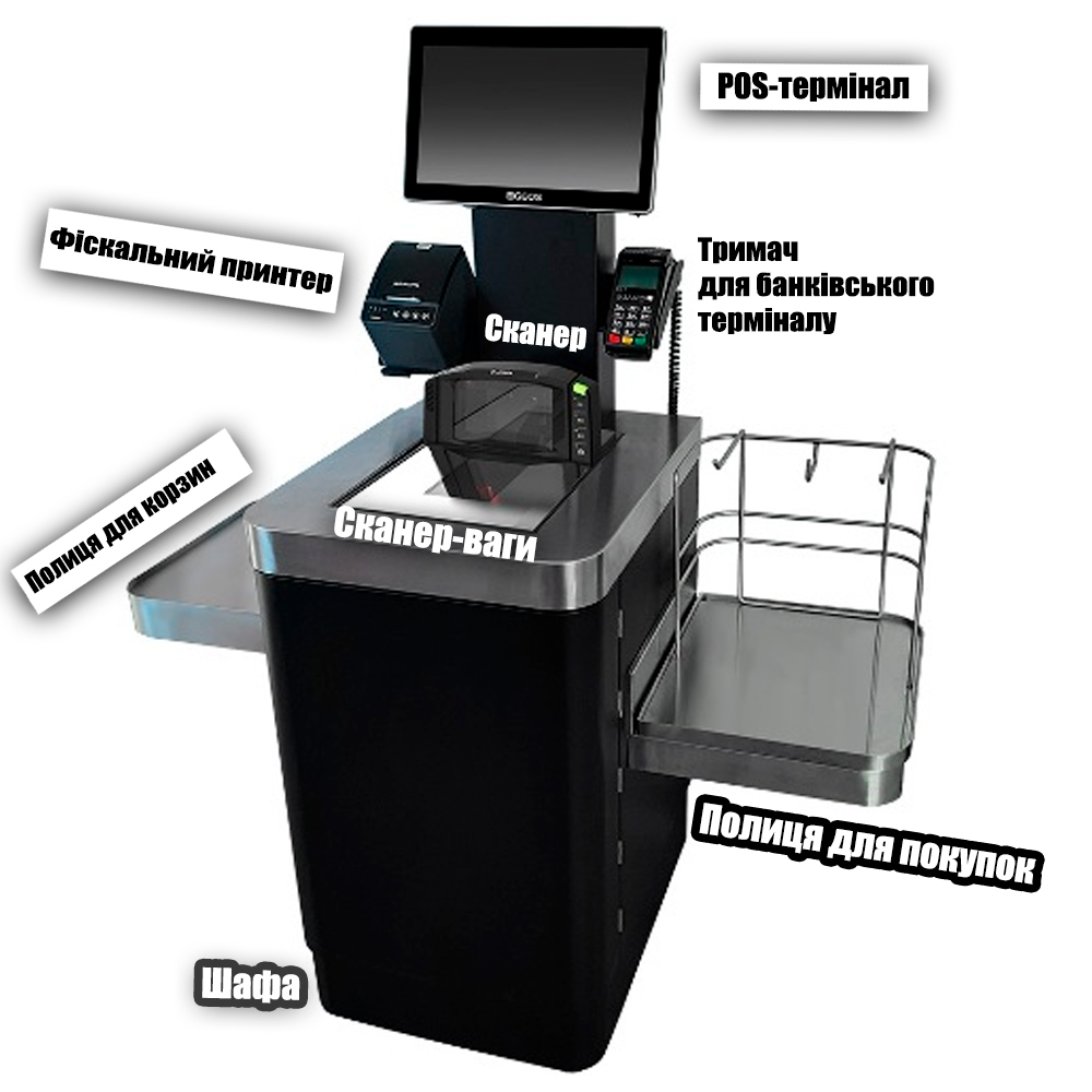 Шкаф, Монитор, Терминал, Полки х2 (для корзин и покупок), Сканер-весы, Держатели |