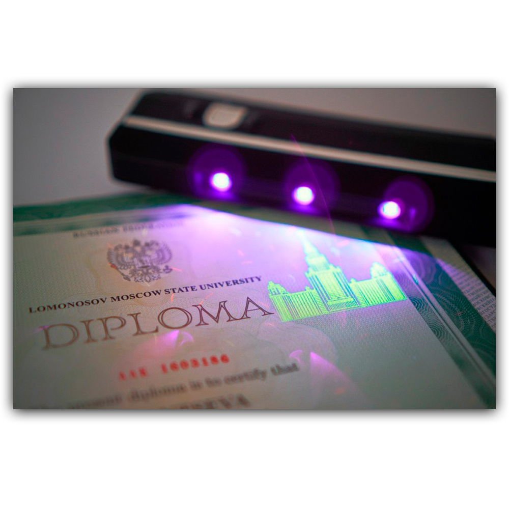 - Перевірка будь-яких документів, що мають УФ-образ або водяні знаки