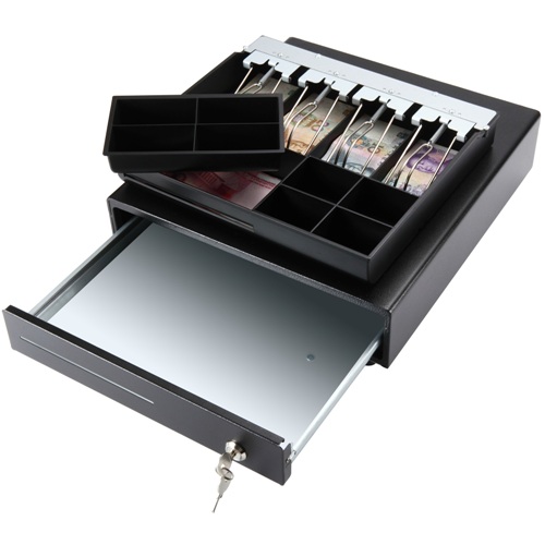 ASAP POS M-330S – класичний висувний грошовий ящик призначений для зберігання грошових коштів (купюр, монет) і чеків. Грошовий ящик має внутрішній пластиковий вкладиш, який має 8 нерегульованих відділень для монет і 4 для банкнот, а також оснащений спеціальними металевими тримачами купюр.