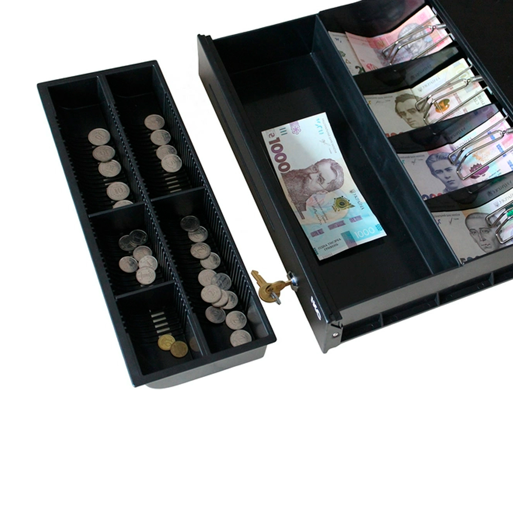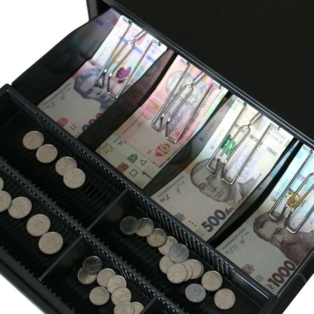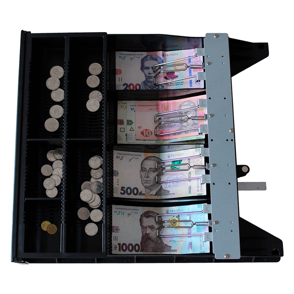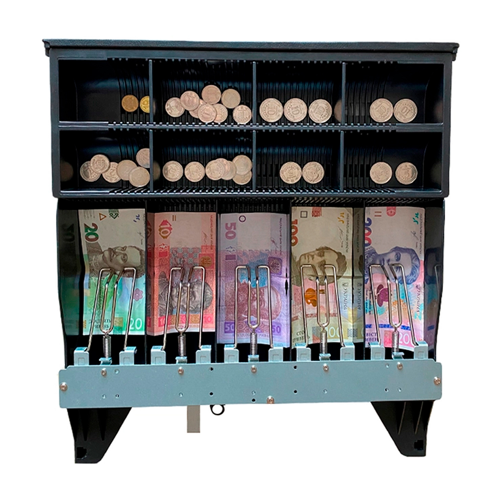 Конструкція відділень для монет та купюр дозволяє змінювати їх ширину, що дозволяє легко розміщувати купюри та монети будь-якого номіналу.