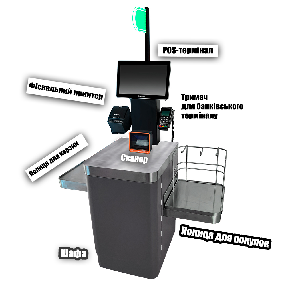 Шафа, Монітор, Термінал, Полиці х2 (для кошиків та покупок), Сканер, Тримачі |