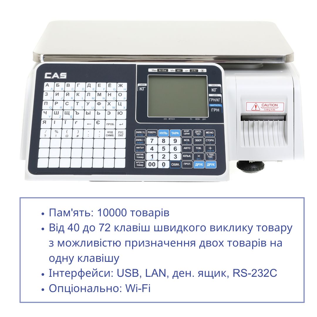 Технічні характеристики Модель CAS CL3500-B поставляється з попередньо встановленим програмним забезпеченням CL-Works. Обсяг пам’яті ваг дозволяє зберігати дані про 10000 товарах. Є можливість налаштувати 54 клавіші швидкого доступу для моментального переходу до необхідної інформації. Пристрій може експлуатуватися при температурі від -10 до + 40 ° С. Перелік підтримуваних вагами штрих кодів: UPC, EAN13, EAN13A5, I2OF5, CODE128, CODE39, CODE93, CODABAR і IATA2OF5.